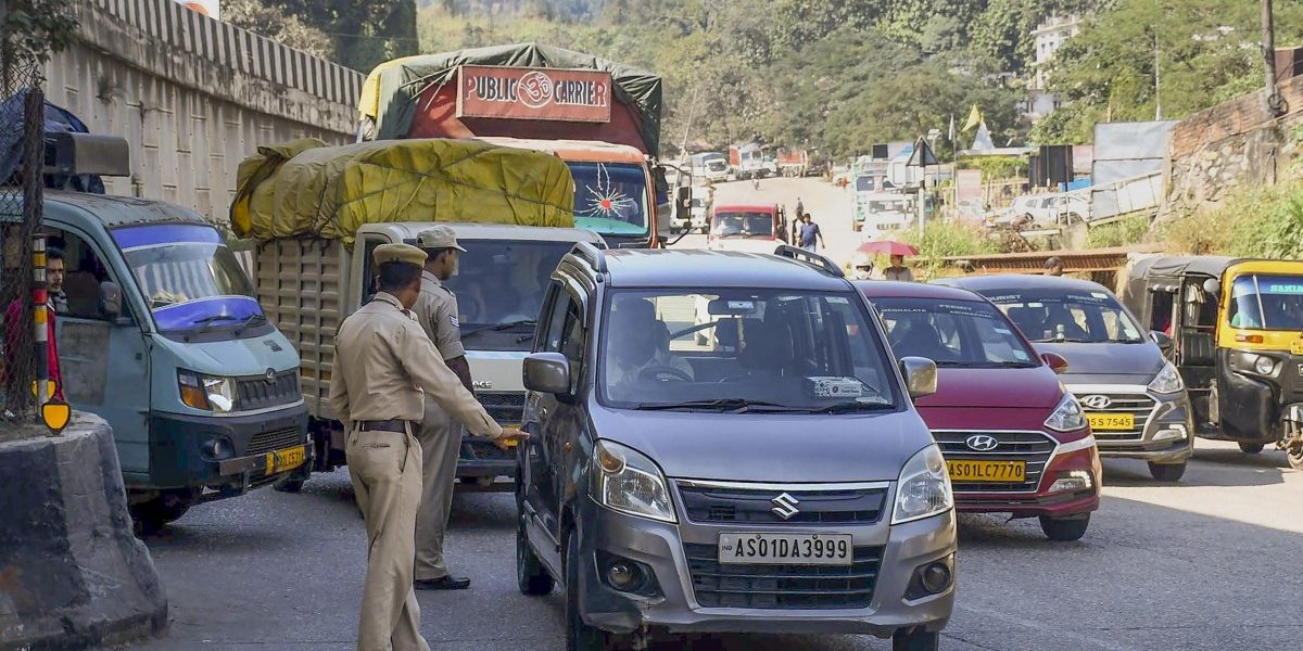 Assam Police personnel stop Meghalaya-bound vehicles for safety reasons.