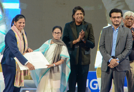 कोलकाता । महिला विश्व कप 2025 में भारतीय टीम को चैंपियन बनाने में अहम भूमिका निभाने वाली विकेटकीपर बल्लेबाज ऋचा घोष को शनिवार को ईडन गार्डन्स में आयोजित समारोह में पश्चिम बंगाल की मुख्यमंत्री ममता बनर्जी ने सम्मानित किया।